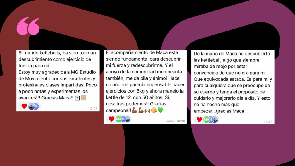 «Hacer ejercicio con las Ketlebells te abre a un nuevo mundo de posibilidades. Es verdad que al principio parece que puedes hacer lo mismo con unas pesas pero cuando haces los ejercicios con las KB te das cuenta que es mucho mejor con ellas.O s aseguro que es un vicio y te das cuenta que tener variedad de pesos te permite ir combinando. Gracias Maca por descubrirnos este mundo!!»